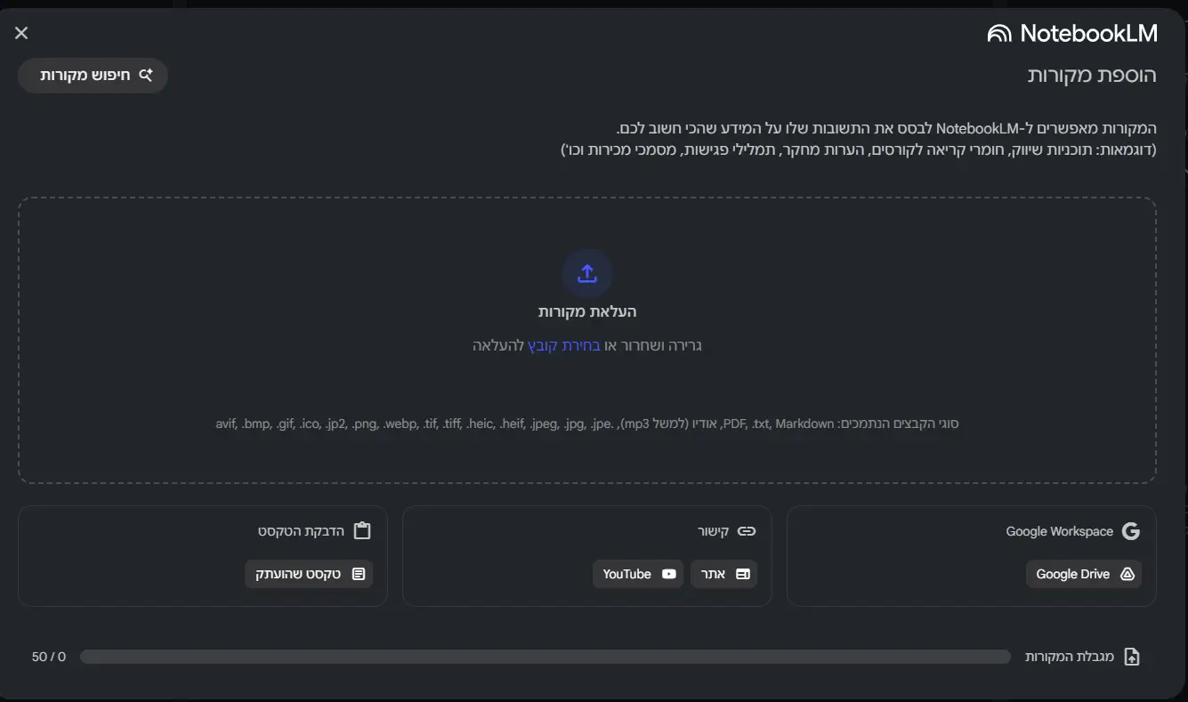 המערכת תומכת במגוון רחב של סוגי קבצים ופורמטים, כולל מסמכי PDF, קבצי Word, גיליונות אלקטרוניים של Google Sheets, מצגות, קבצי טקסט רגילים, ואפילו קישורים לאתרי אינטרנט וסרטוני YouTube. אתה יכול להעלות קבצים ישירות מהמחשב שלך, לחבר מסמכים מ-Google Drive שלך, או להדביק כתובות URL כדי לאסוף תוכן מהרשת. המערכת גם תומכת בתמונות ומסמכים חזותיים, ומסוגלת לחלץ טקסט ומידע מהם. היכולת לעבוד עם מגוון כה רחב של מקורות מאפשרת לך לבנות מחברות מקיפות המשלבות סוגי תוכן שונים ולנתח אותם יחד כדי לקבל תמונה שלמה ומעמיקה יותר של הנושא שאתה חוקר. כל המקורות האלו יכולים להיות מנוהלים בצורה נוחה בתוך פאנל המקורות של המערכת, המאפשר לך לעבור בקלות בין מסמכים שונים ולראות איך הם קשורים זה לזה.